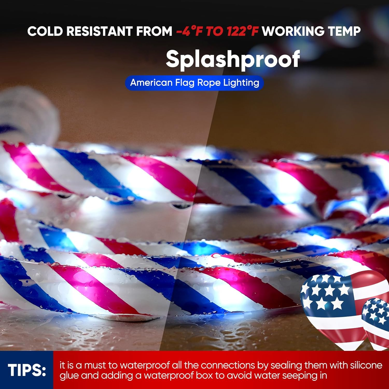 AMERICAN FLAG COLORWAY -> this led rope light spliced red, white and blue spiral on coating, making it a perfect decoration for most festival or events, like Memorial Day, Veterans Day, Independence Day, Election Day, Easter etc.